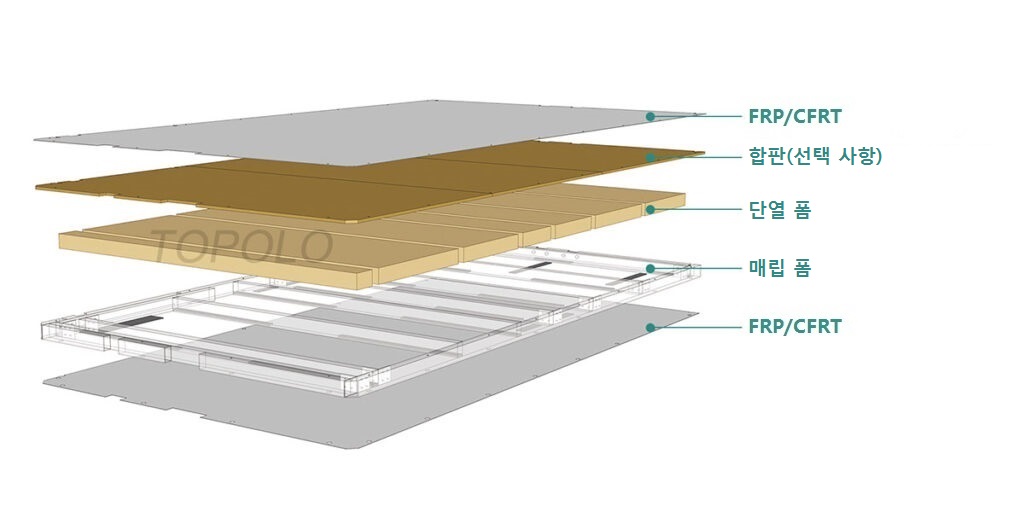 단열 패널의 표면 소재는 FRP(유리 섬유 플라스틱) 또는 CFRT(연속 섬유 강화 열가소성 플라스틱)이고, 심재는 경질 폐포 폼(XPS/PU/PET)입니다. 보다 안정적인 구조를 얻기 위해 다양한 구조적 프로필(목재, 플라스틱, 강철, 알루미늄 등)을 패널에 매립하거나 단열재(합판, GMT, 알루미늄 등)를 표면과 코어 사이에 추가합니다.