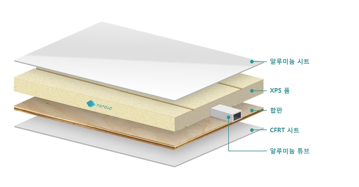 XPS(압출 폴리스티렌) 폼, CFRT(연속 섬유 강화 열가소성 수지) 시트, 알루미늄 시트, 합판, 알루미늄 압출 튜브를 결합한 제품입니다. 다양한 특성을 가진 소재의 복합 소재로 제작되어 견고하고 내구성이 뛰어나며, 방수 및 단열성이 뛰어납니다. 독창적인 디자인으로 설치가 간편하고 다양한 기능을 제공합니다.